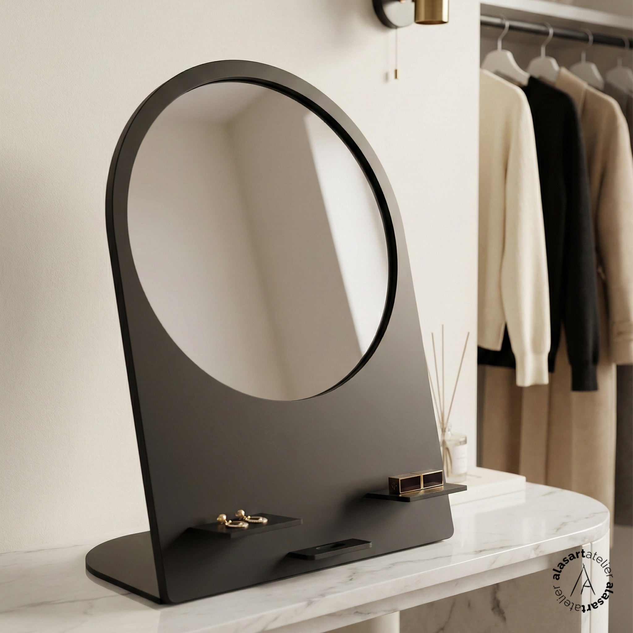 Telefon standı ve makyaj malzemesi rafı ile birlikte tasarlanan bu maki̇yaj aynası, hem hazırlanma rutininizi kolaylaştırır hem de masaüstünüzü toparlar.